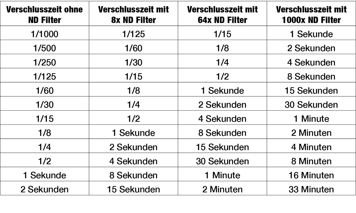 Mit dieser #jaworskyj ND Filter Tabelle kannst du ablesen, wie du die Kamera mit den unterschiedlichen #jaworskyj ND Filtern einstellen musst. Stelle dafür z.B. die Blende auf F9 und den ISO auf 100 und lies die Verschlusszeit für eine korrekte Belichtung ohne ND Filter ab. Nun schau in der Tabelle nach, welche Verschlusszeit du mit dem entsprechenden Filter benötigst. Schraube den #jaworskyj ND Filter auf und passe die Verschlusszeit laut Tabelle an.
